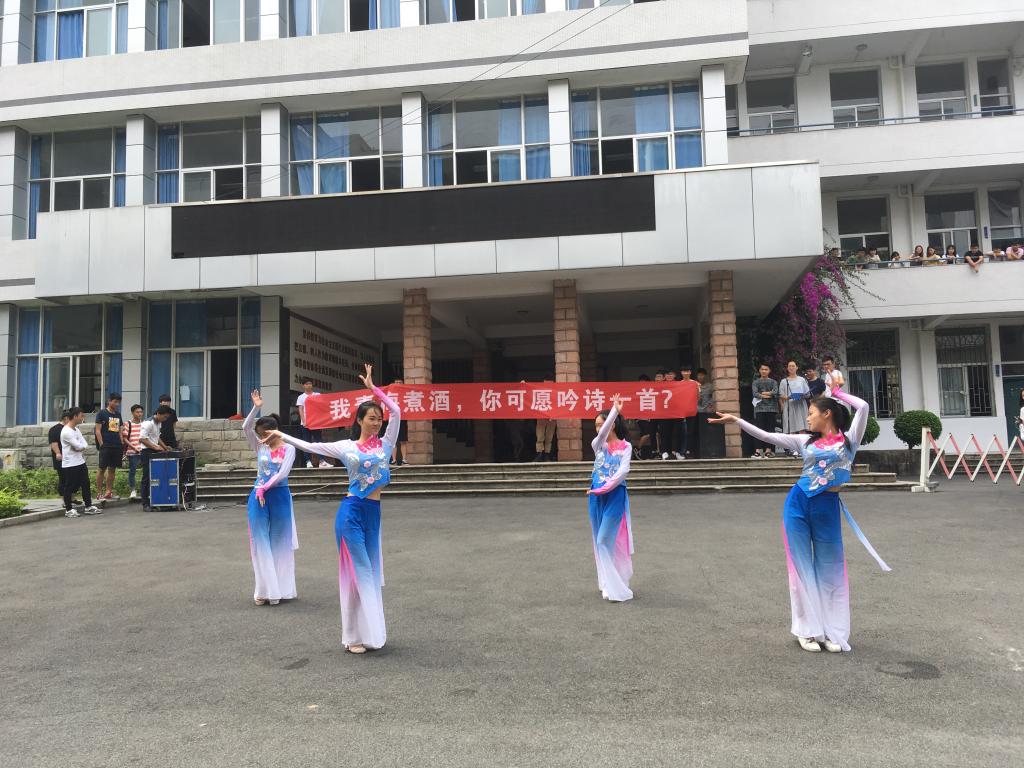 首先是由乐器社和声乐社的三位同学现场进行吉他弹奏演唱“至少还有你”,歌声袅袅,萦绕校园,顿时吸引了大家的目光。“炊烟袅袅升起,而我在等你”。随后舞蹈社四位同学带来的“青花瓷”舞蹈,曼妙的舞姿,动人的旋律,更是将现场气氛引向了高潮。最后在文学社“以梦为马”的现场深情朗诵中,书法社成员挥毫泼墨,一气呵成地完成了现场书法展示。