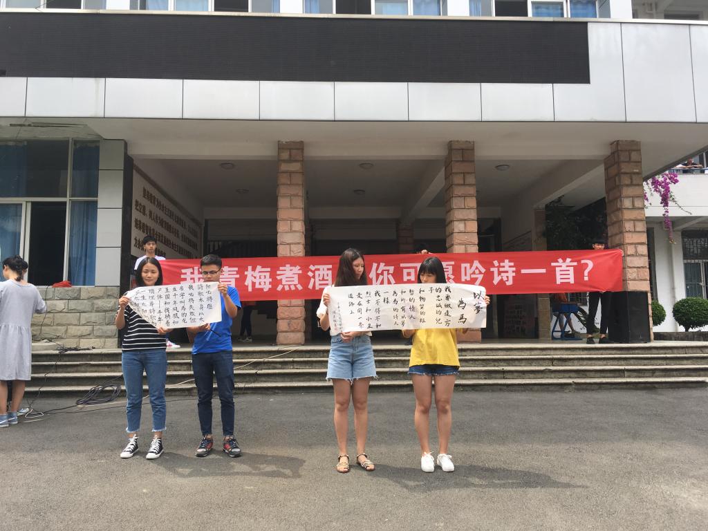 为了更好地宣传“诗词大会”活动,吸引更多的老师、同学参加,职业学院高职文艺部、社联部联合策划的以“我青梅煮酒,你可愿吟诗一首?”为口号的校园“快闪”宣传活动于5月17日上午10点至10点20分在博学楼前小广场拉开序幕。