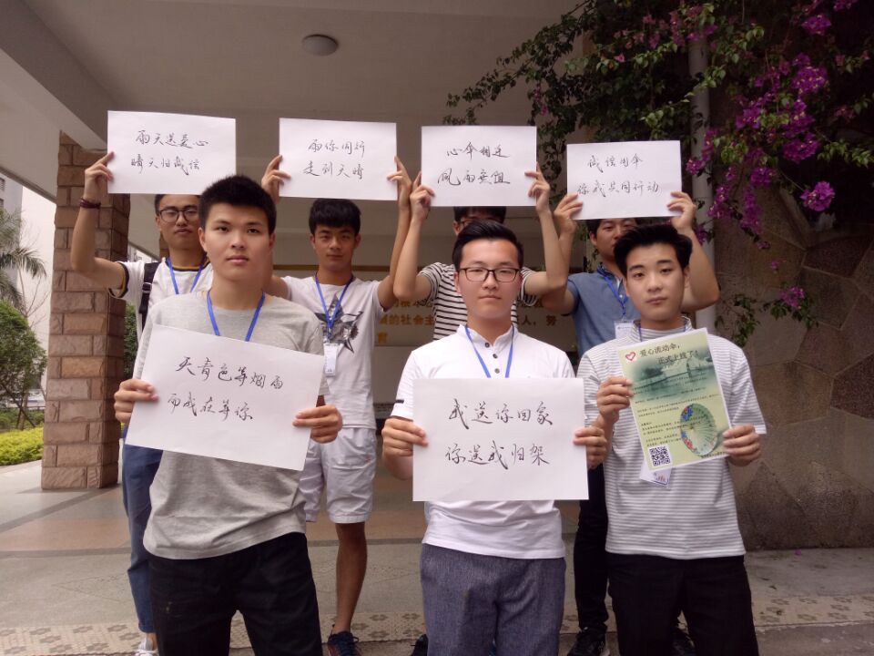 身处南国,时常遇到让人措手不及的雨天。为了让学院广大师生感受到校园大家庭的温暖,为没带伞的同学提供帮助,职业学院青年志愿者协会于5月8日中午11:30-12:00,在博学楼一楼大厅举行了宣传签名仪式,正式启动爱心流动伞活动。